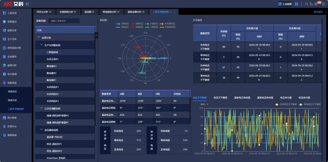 对谐波、不平衡度等专业电能质量参数进行持续监测,实现对配电设备实时监测和故障诊断,提升运维效率,为企业生产用电保驾护航。