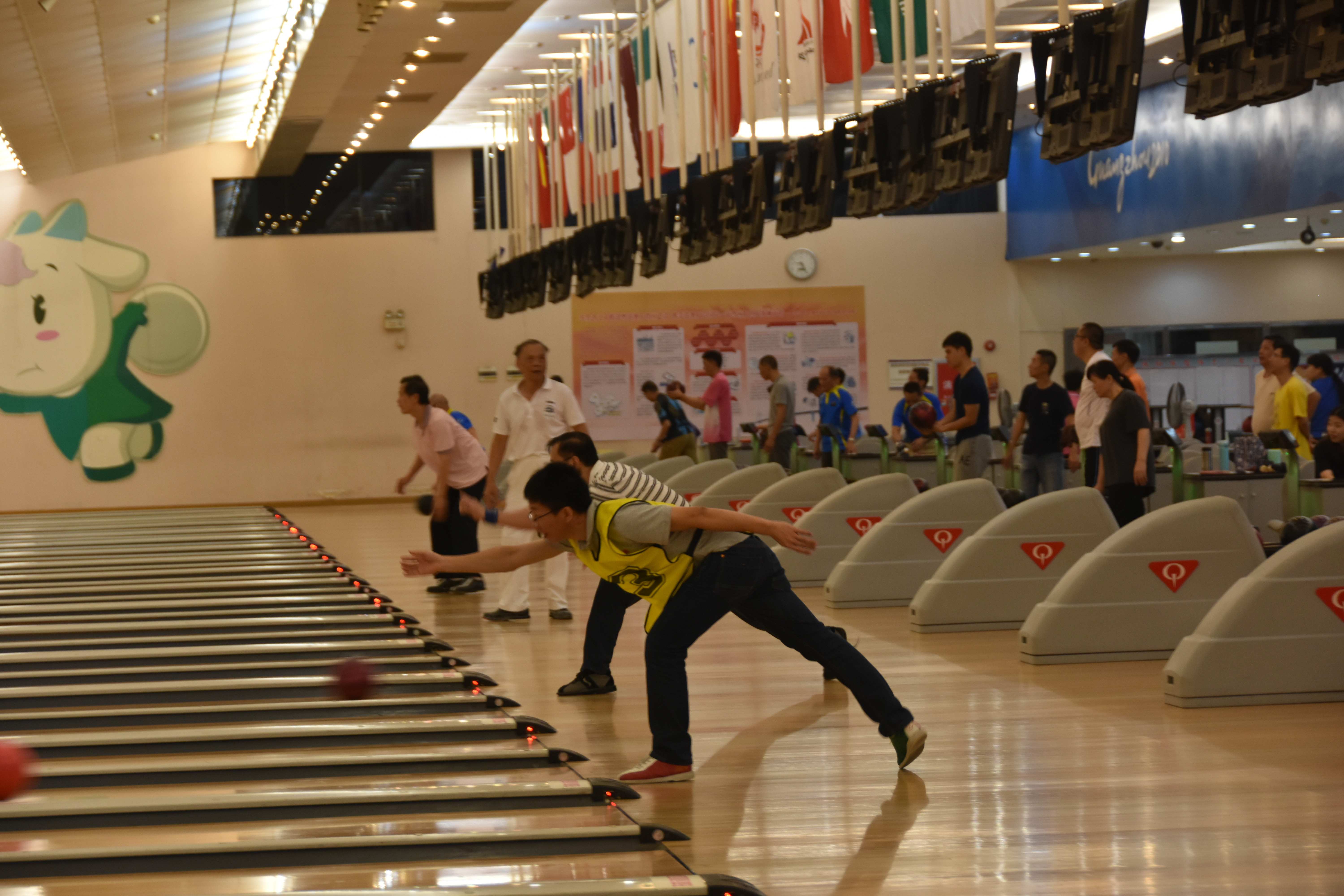 比赛开始,来自不同单位的参赛者被分为若干小组,各个参赛小组在各自赛道上尽展飒爽英姿,为小组荣誉打好每一个球。助走、出手、观察球的线路、分析击打效果,平日里所有的疲惫似乎在球被击倒的那一刻也被击个粉碎,随即被球馆里四处洋溢的热情一驱而散。