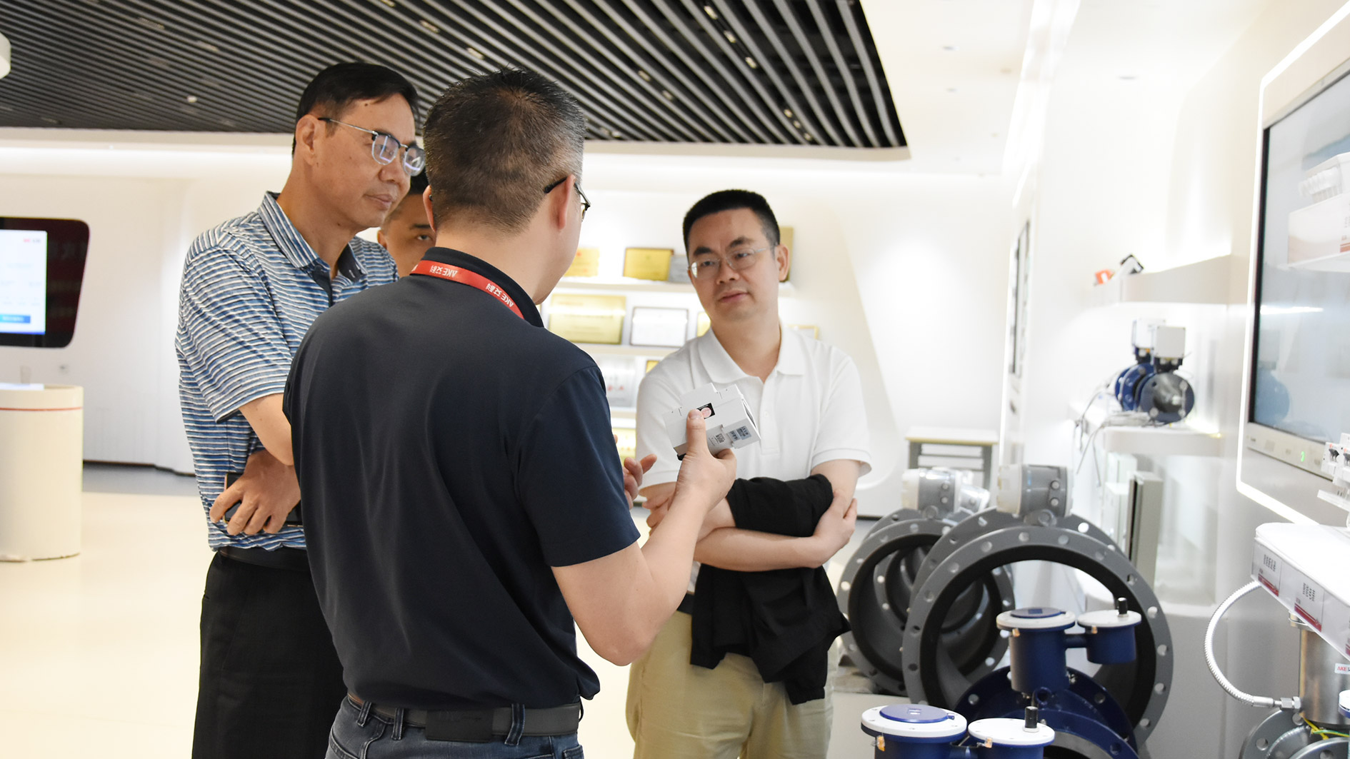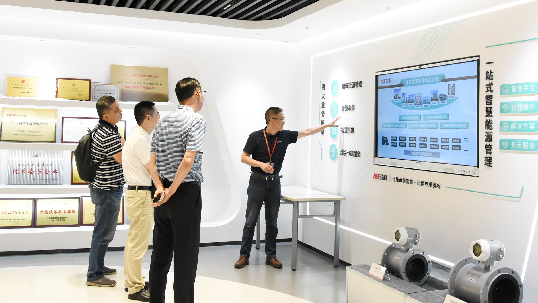 在威廉希尓指数500产品体验中心,威廉希尓指数500副总经理李飞龙全面介绍了公司的发展历程、业务布局,现场讲解了威廉希尓指数500自主研发的0.2级电磁流量计、1级电磁热量表、风盘控制器等核心硬件产品的优势性能、节能技术创新点以及成果应用案例。