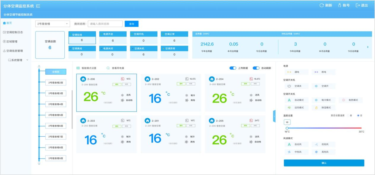 通过在房间内安装分体空调控制器,结合远程智能管理系统平台,可集中监控空调运行状态,对独立分布在各个房间的空调进行统一管理。通过系统平台集中监控或通过手机操控,实现高效管理,避免能源浪费。